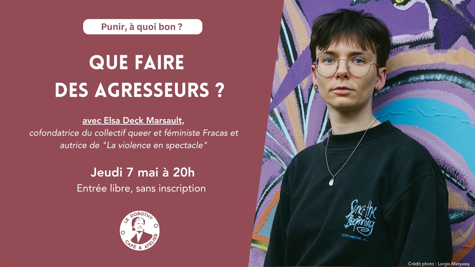 Pour la première conférence du cycle « Punir, à quoi bon ? » nous avons l’honneur de recevoir Elsa Deck Marsault, penseuse abolitionniste, autrice de « Faire justice » (2023) et de « La violence en spectacle » (2026).